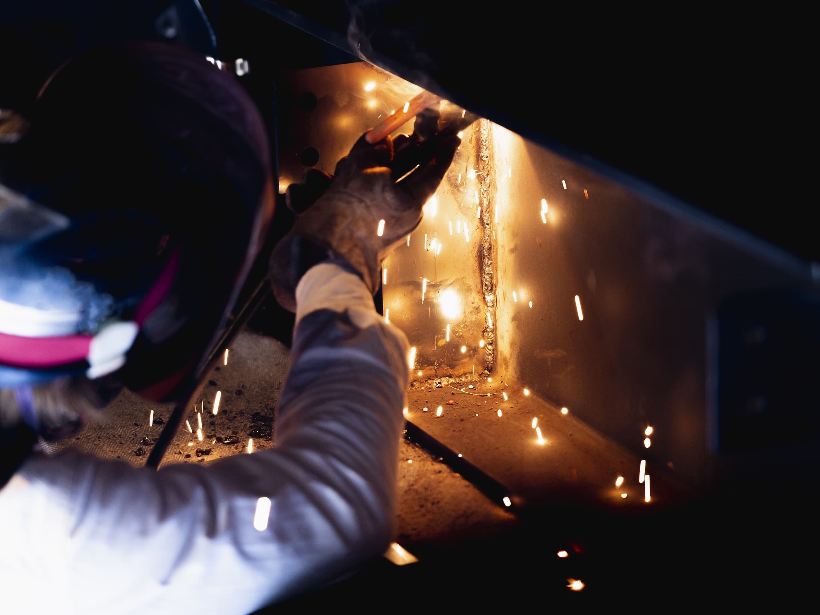 鉄、ステンレスなどの鋼板、形鋼材を溶接、切断、穴開け曲げ加工し、立体的に組み上げる作業です。